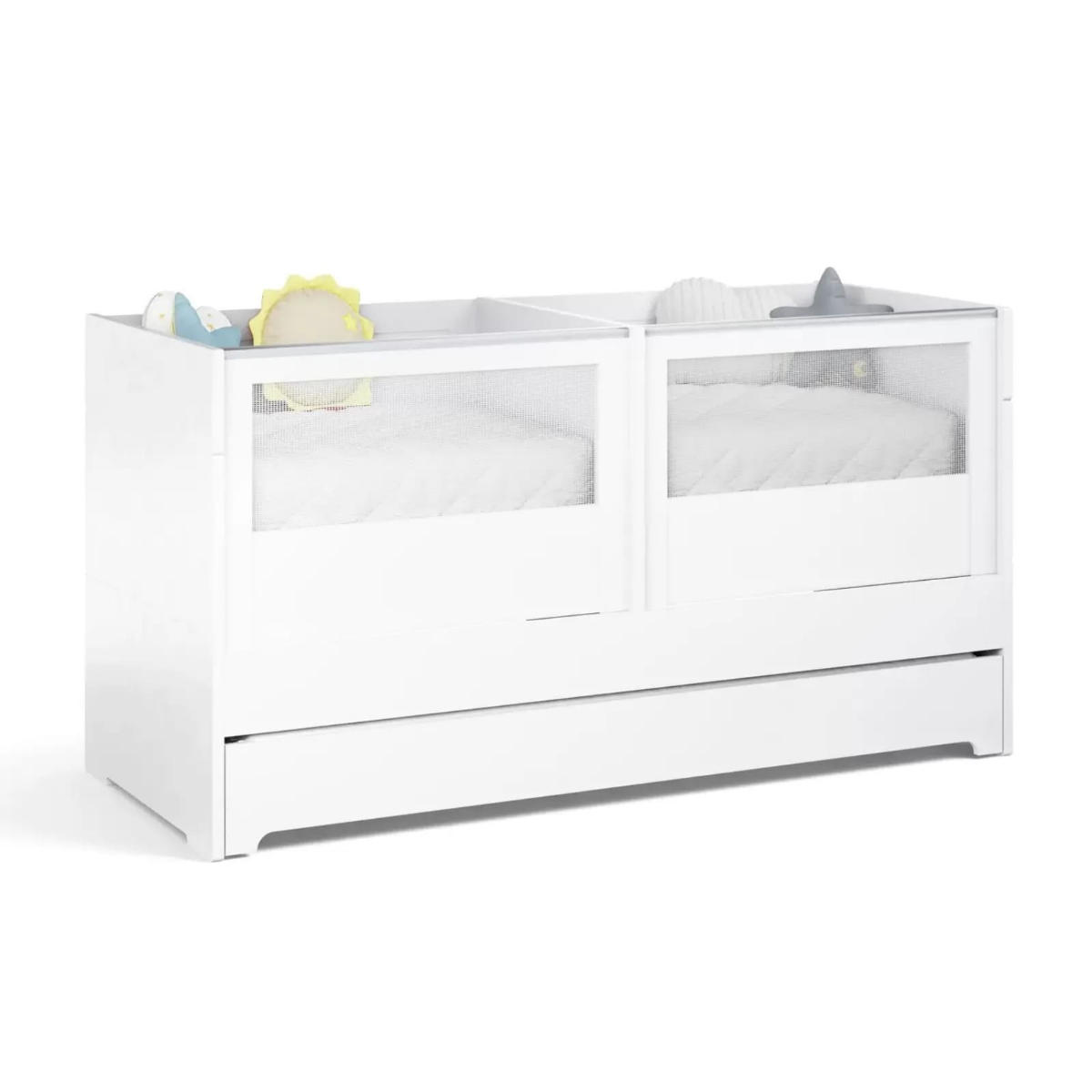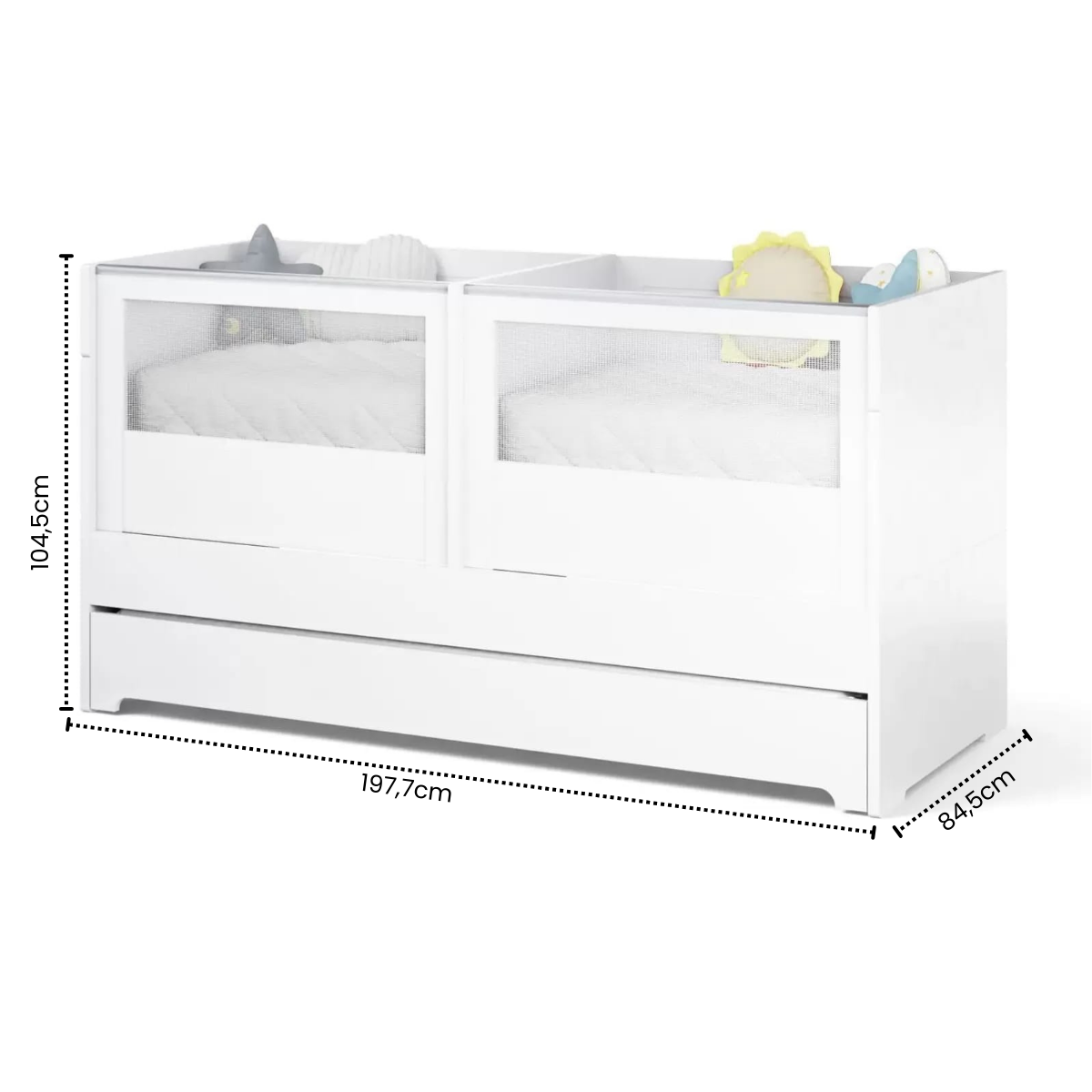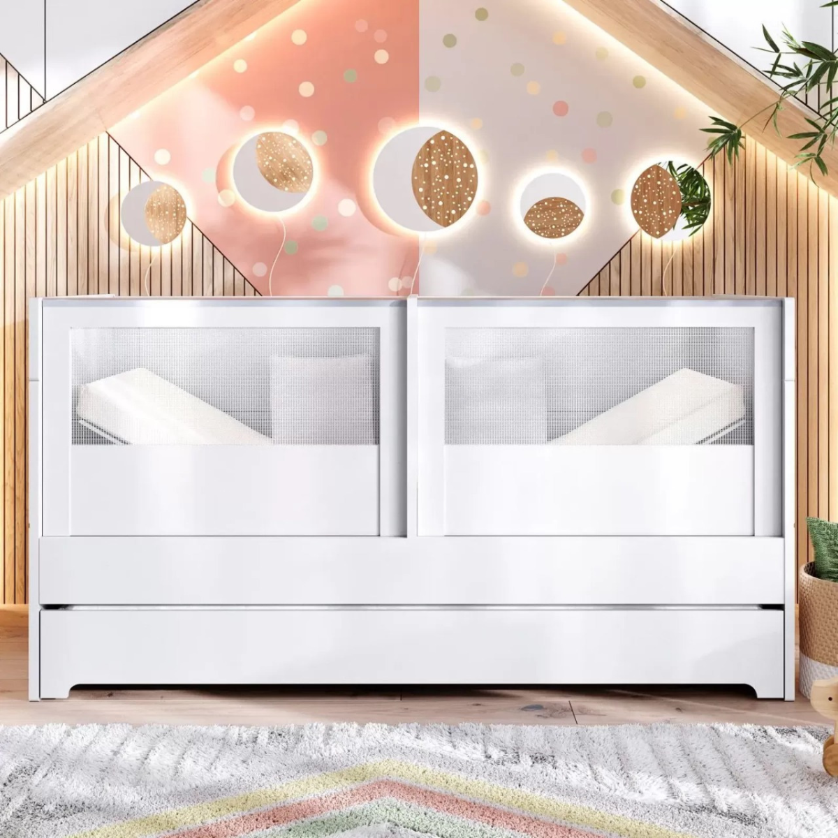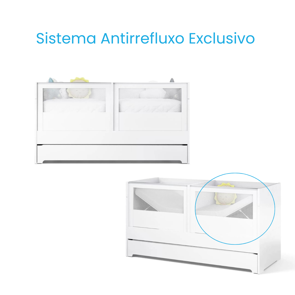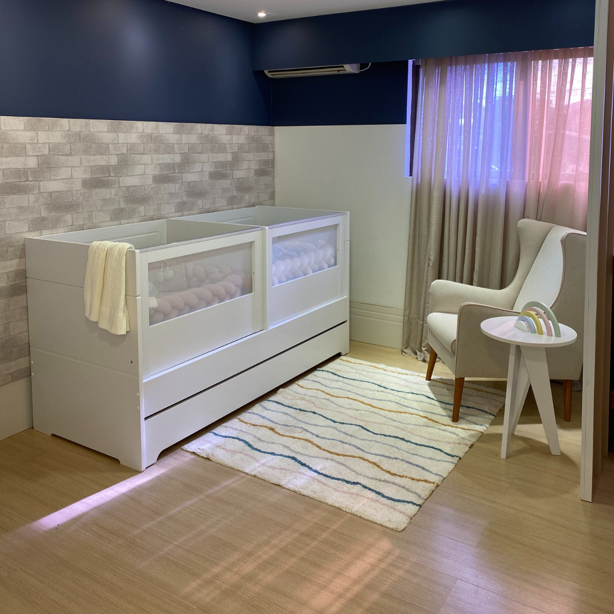 Praticidade em dobro: resolve o problema de espaço para pais de gêmeos com um único móvel Cores Disponíveis: Branco Acetinado Estética leve que não "pesa" no ambiente, mesmo sendo um móvel grande Segurança certificada com grades robustas e acabamento atóxico