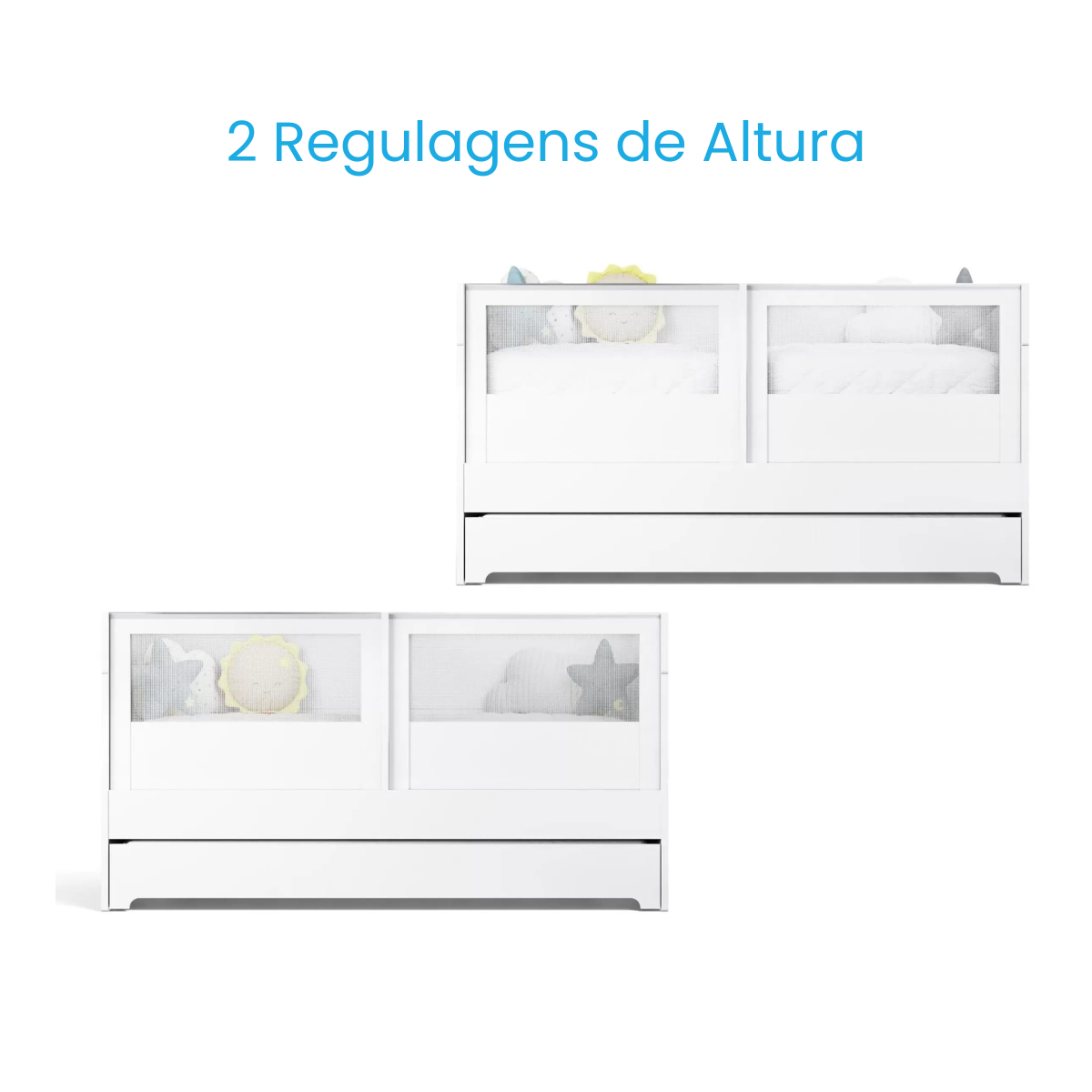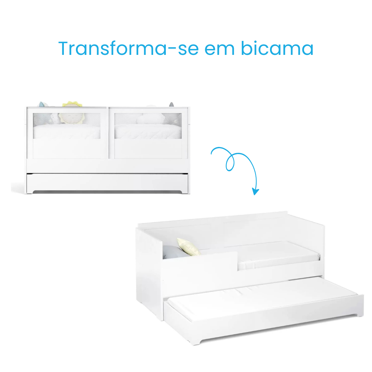 Design exclusivo para gêmeos: espaço amplo e seguro para dois bebês Sistema evolutivo: transforma-se em uma Bicama de solteiro espaçosa Grades laterais com tela em poliéster: facilita a visualização dos bebês e a circulação de ar Estrutura reforçada em MDF de 25mm nas cabeceiras Acompanha 2 colchões especiais (93x74cm) para a fase de berço