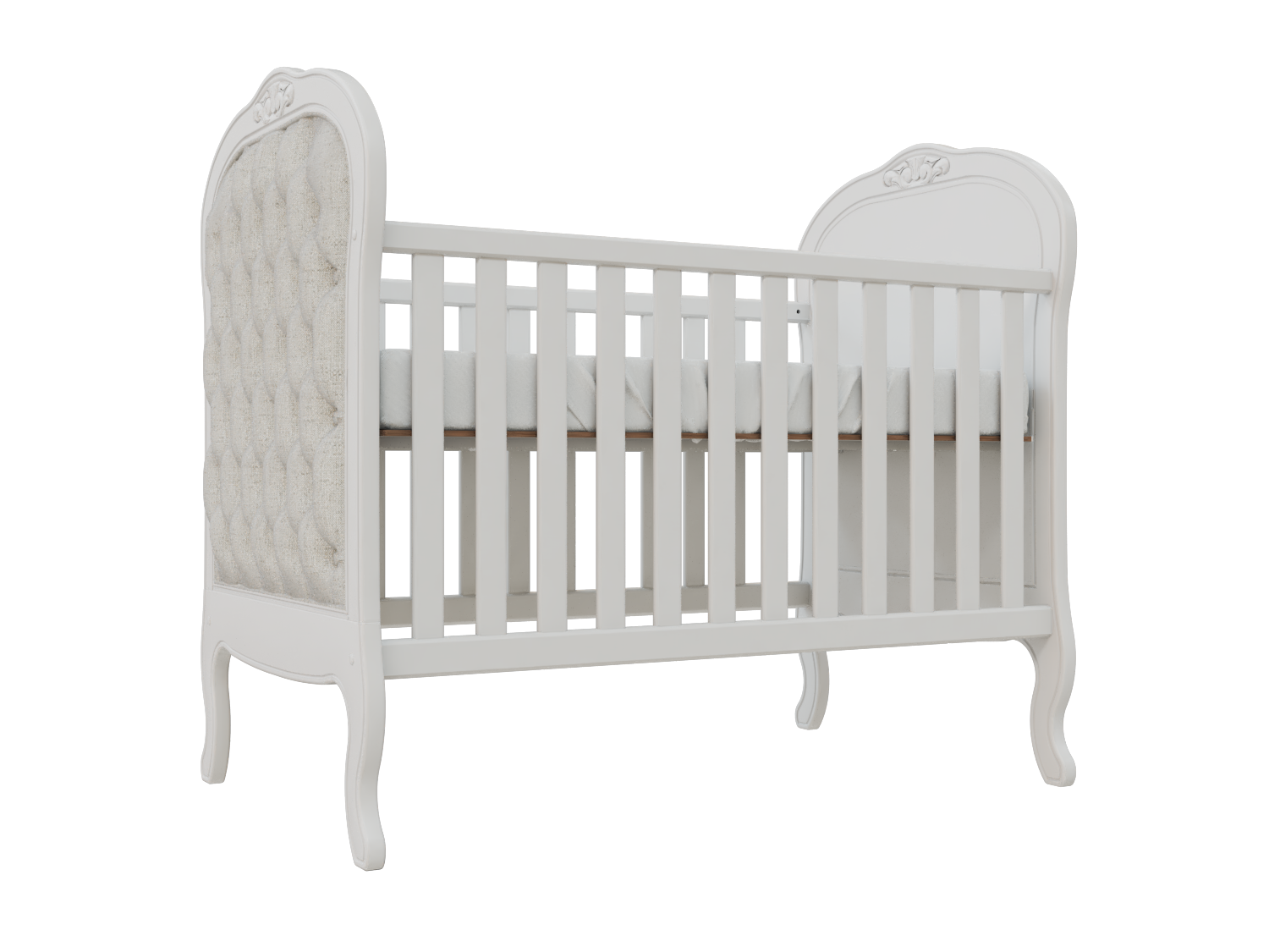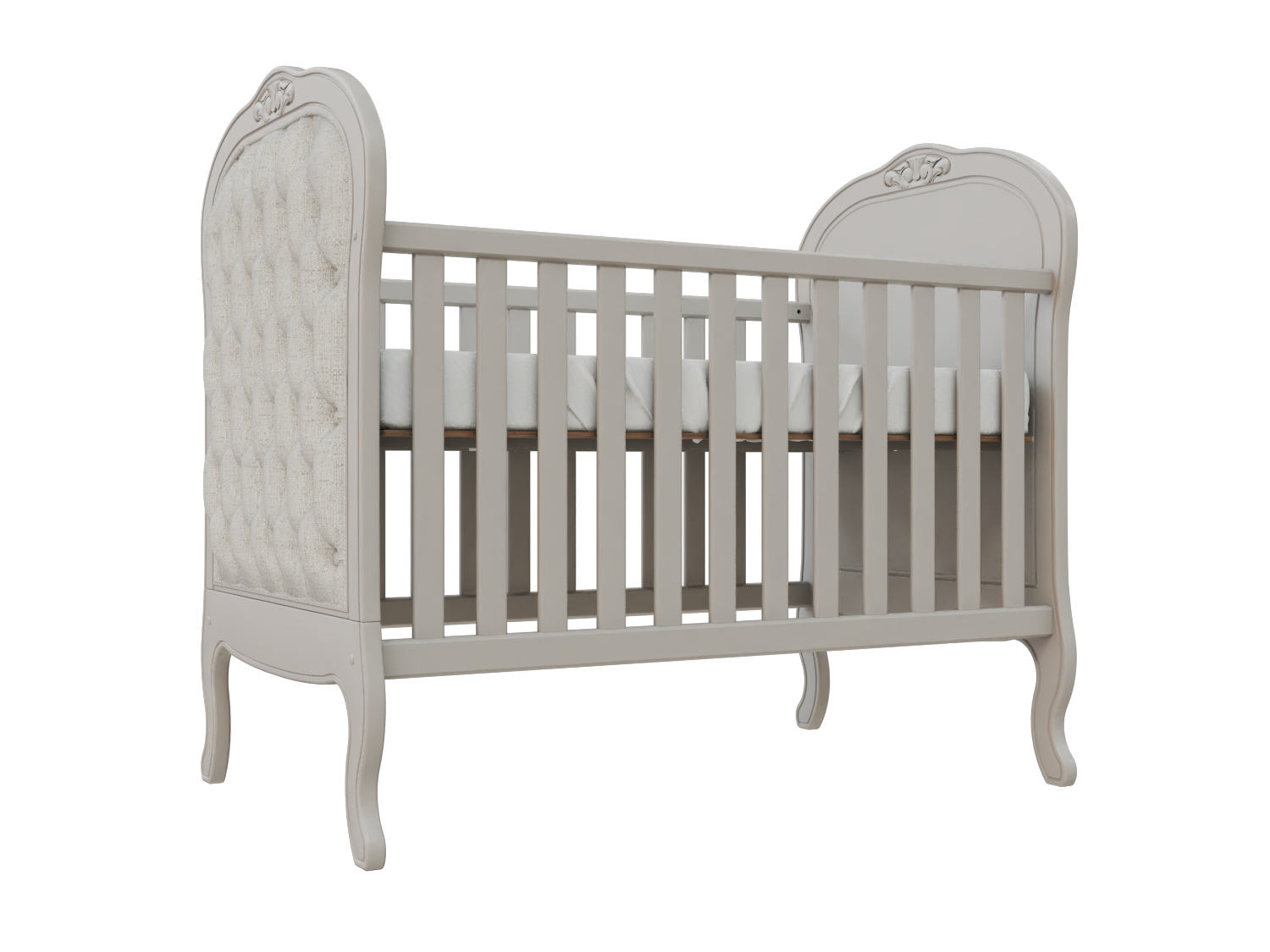 Berço de alto padrão com design clássico e entalhes manuais, projetado para ser a peça central de um dormitório sofisticado Estrutura produzida em madeira de eucalipto tratado e MDF de alta densidade Grades fixas que proporcionam total estabilidade e segurança Acabamento premium em laca acetinada