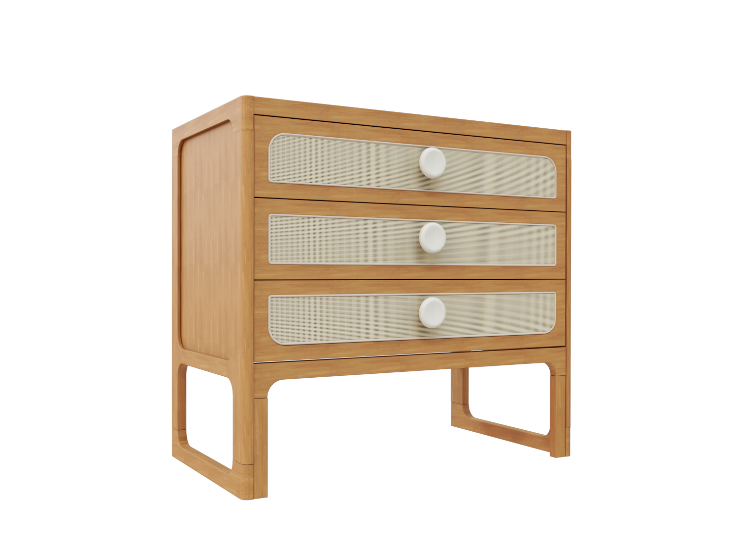Cômoda funcional com três gavetas espaçosas e detalhes exclusivos em palha sintética natural Fabricada em madeira de eucalipto tratado e seco em estufa com acabamento em tom tauari Puxadores exclusivos e coloridos que trazem um charme lúdico e personalizado ao móvel Design alinhado à tendência Skandi