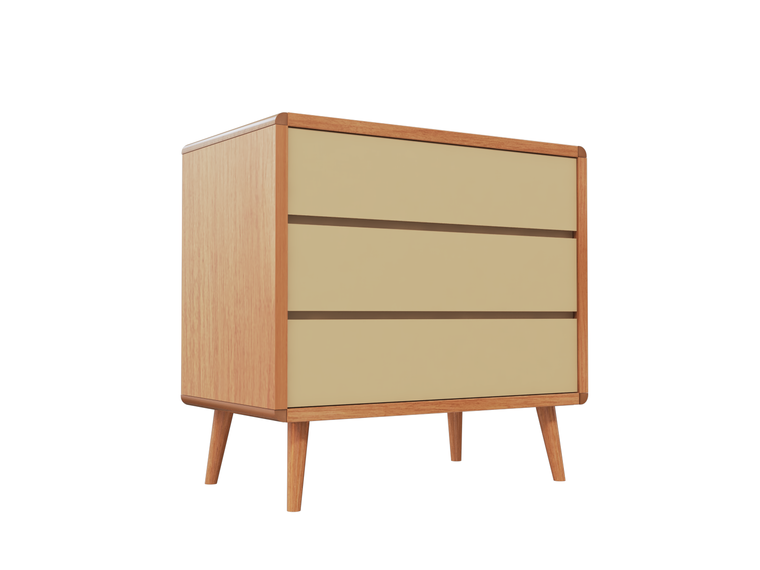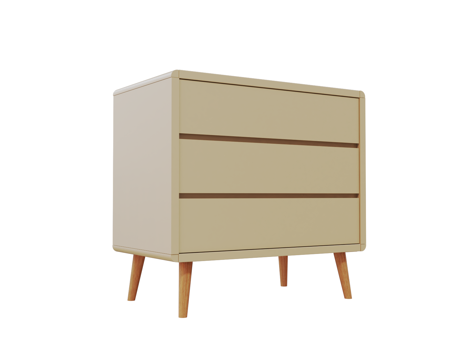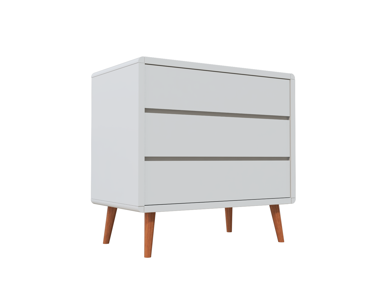 Cômoda moderna com três gavetas espaçosas e base elevada em metalon, facilitando a limpeza do ambiente Estrutura produzida em MDF cru de eucalipto com acabamento de alto padrão Possui corrediças telescópicas que garantem uma abertura suave e silenciosa Puxadores usinados que reforçam o design clean e sofisticado